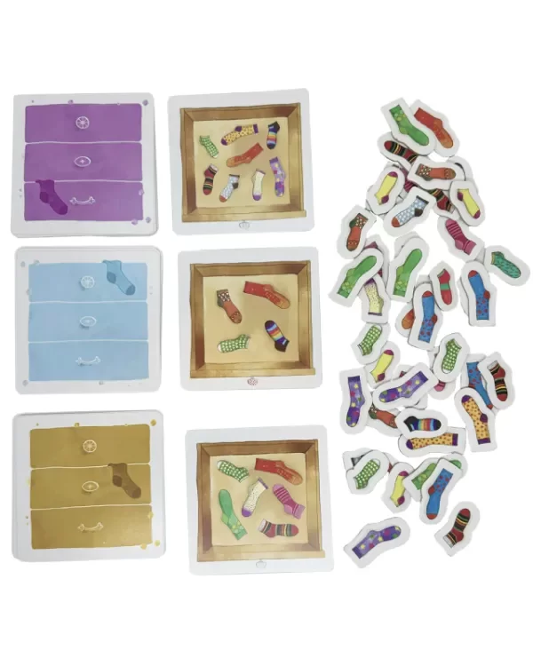 Con cada lavado, las medias se desordenan y nunca quedan junto a sus pares. En este juego, cada jugador debe completar su cajón de medias.