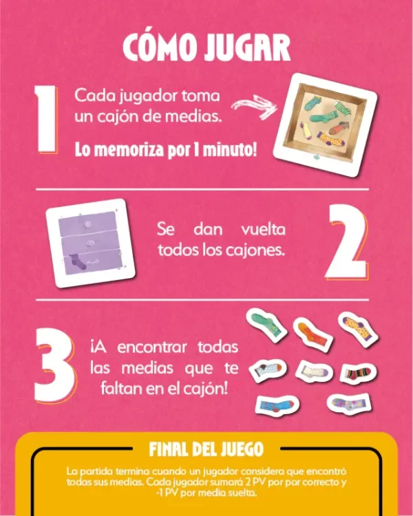 Combinando la memoria y la percepción visual, los jugadores deben memorizar las medias que tienen en su cajón de medias y luego buscar entre las medias desordenadas las que corresponden para completar sus pares.